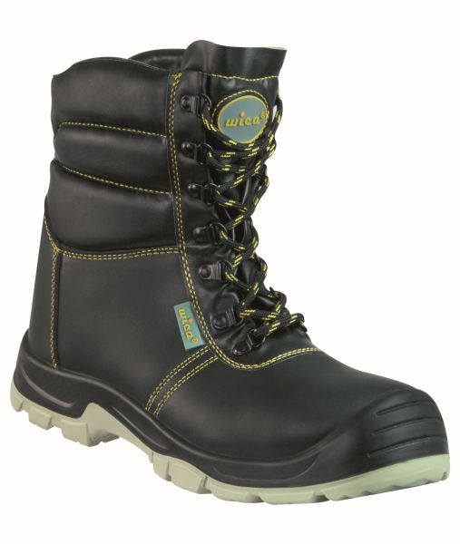 wica®-Winterstiefel. Schaft aus Glattleder, gepolsterter Kragen, angenähte, gepolsterte und webpelzgefütterte Staublasche. Verschluss durch Triangels. Webpelzbedeckte Decksohle. Kunststoffkappe und durchtrittsichere Gewebezwischensohle, dadurch keine sogenannte Kältebrücke mehr. Antistatische, öl- und säurebeständige, rutschhemmende 2-Schichten-PUR-Laufsohle. Hellgraue Laufsohle, nicht kreidend. Weite 11